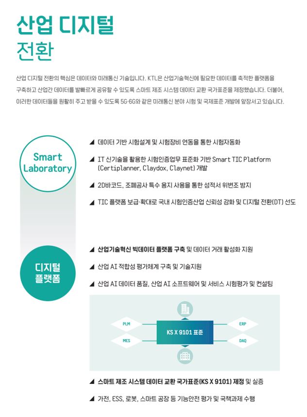 특히, 최근에 대두가 되고 있는 산업분야의 디지털 전환의 핵심은 데이터와 미래통신 기술로, 산업기술혁신에 필요한 데이터를 축적한 플랫폼을 구축하여 운영하고 있으며, 이런 데이터의 원활한 교류를 위해 5G/6G와 같은 미래통신 분야 시험과 국제표준 개발에 참여함으로써 국가 미래 산업을 선도하고 있습니다.