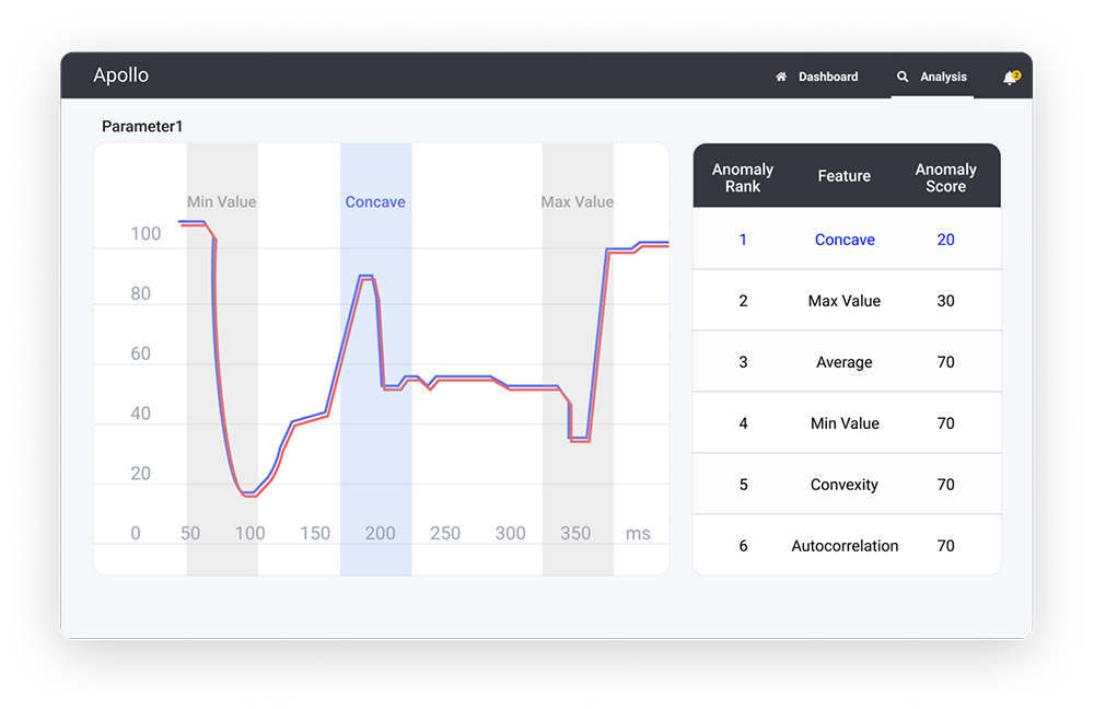 '아폴로'는 제조 장비의 방대한 센서 데이터를 효과적으로 관리하고 분석할 수 있는, 시계열 데이터 기반 이상탐지 솔루션입니다. 자동 이상 탐지 기능으로 패턴 구간을 파악해 이상 원인을 도출할 수 있습니다.