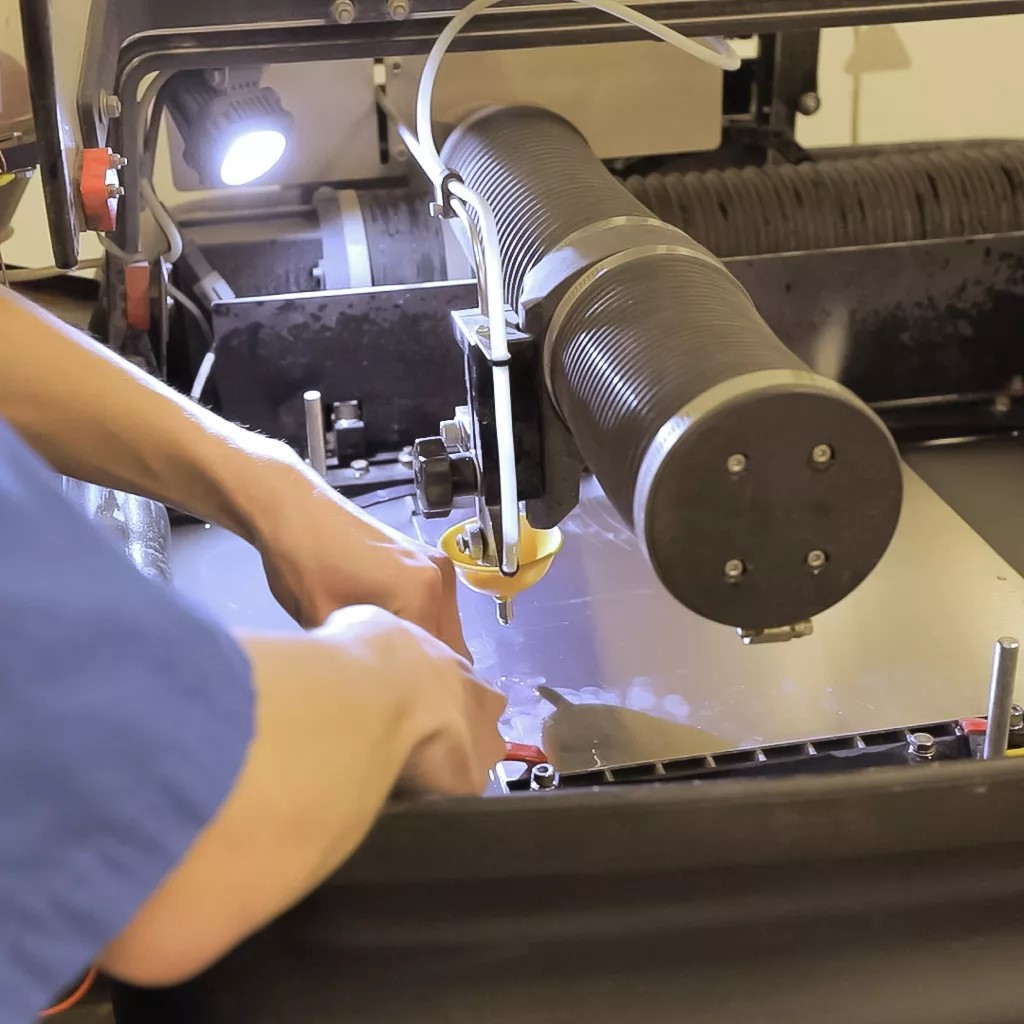 현재 거의 모든 워터젯 업체에서 열문제와 소음이 심한 증압기 방식의 워터젯 펌프를 사용하고 있지만, 저희 오맥스 워터젯은 발생 소음이 현저히 적고, 사용하는 전력과 물의 소비가 적은 고효율 다이렉트 드라이브 방식의 펌프를 30년전에 처음 워터젯 절단용으로 적용하였고, 현재까지 오직 다이렉트 펌프를 연구하고, 발전 시켜 왔습니다.