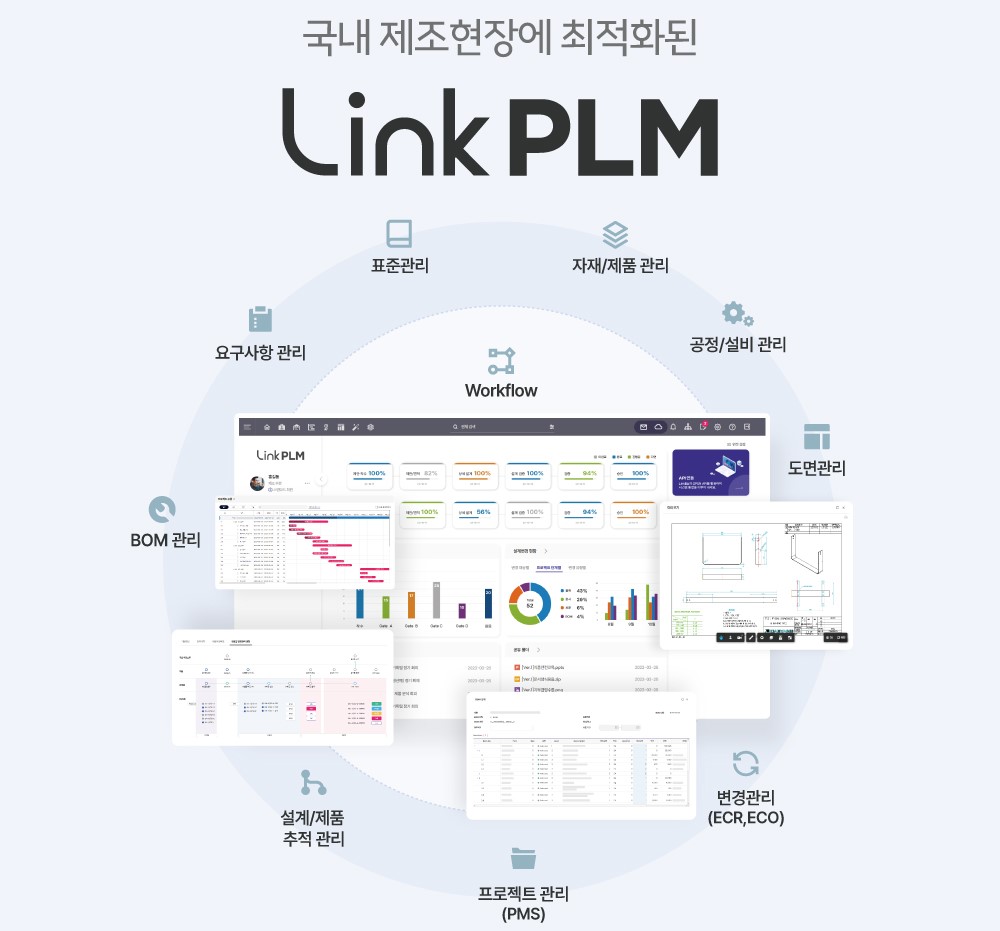 (Link PLM) Link PLM은 마이링크에서 자체 개발한 제품 수명주기 관리솔루션으로 도면관리, BOM(Bill of Materials)관리, 공정/설비 관리, ECO/ECR(설계 변경 관리), 제품 생산 일정과 자동 연동 가능한 PMS(프로젝트 일정 관리 솔루션), 설계/제품 추적 관리, 표준 관리 등 다양한 기능이 갖춰져 있으며, 또한 제조업체별로 구체적인 커스터마이징이 가능하고, 빠른 유지보수 제공이 가능합니다.