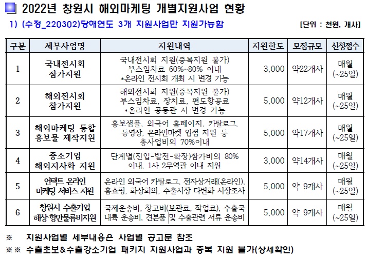 신청방법 ❍ 사업안내 : 창원산업진흥원 홈페이지(www.cwip.or.kr) 공고 참고, 온라인을 통한 사업계획서(신청서) 접수.(필요시 내방접수 가능) ❍ 신청기간 : 2022. 2 ~ 2022. 12. (예산소진시 까지) ❍ 신청방법 : 경상남도 해외마케팅 사업지원시스템 홈페이지 ☞ 온라인신청 : http://trade.gyeongnam.go.kr (경상남도 해외마케팅 사업지원 시스템) ➡ 온라인 지원사업 공고 (사업명 확인 후 신청)